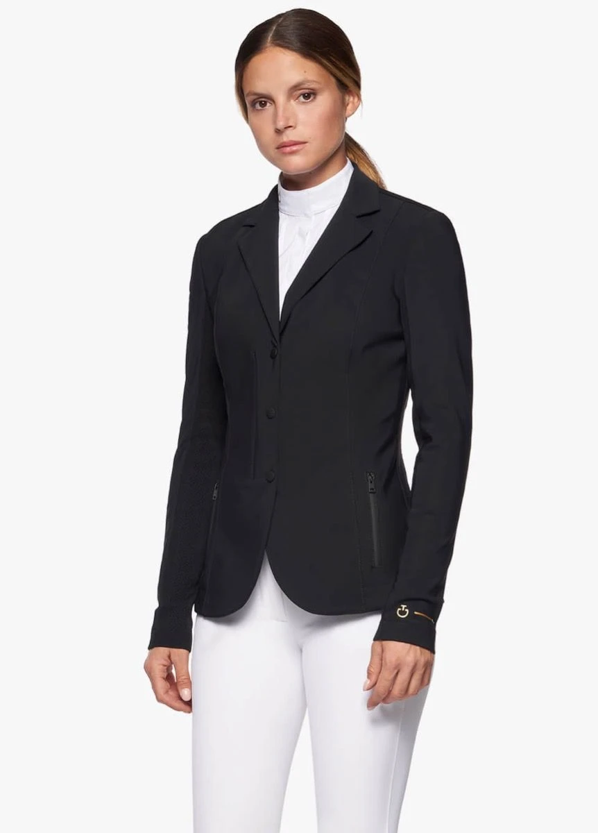 This REVOLUTION riding jacket features a double fabric construction. Sensitive® Fabrics join the technical 3D knits to create a garment with extremely elegant appeal and greatest comfort. Conceived for being extremely performant while riding, the jacket provides high breathability, acting on your body like second skin without preventing your movements. The garment features a technical knit insert on back and arms for optimal humidity control, while the front part is made from water repellent fabric with thermo-dynamic lining to protect you from wind and rain. This jacket features a practical zip and buttons fastening, two zip front pockets and an embroidered logo on the shoulder.