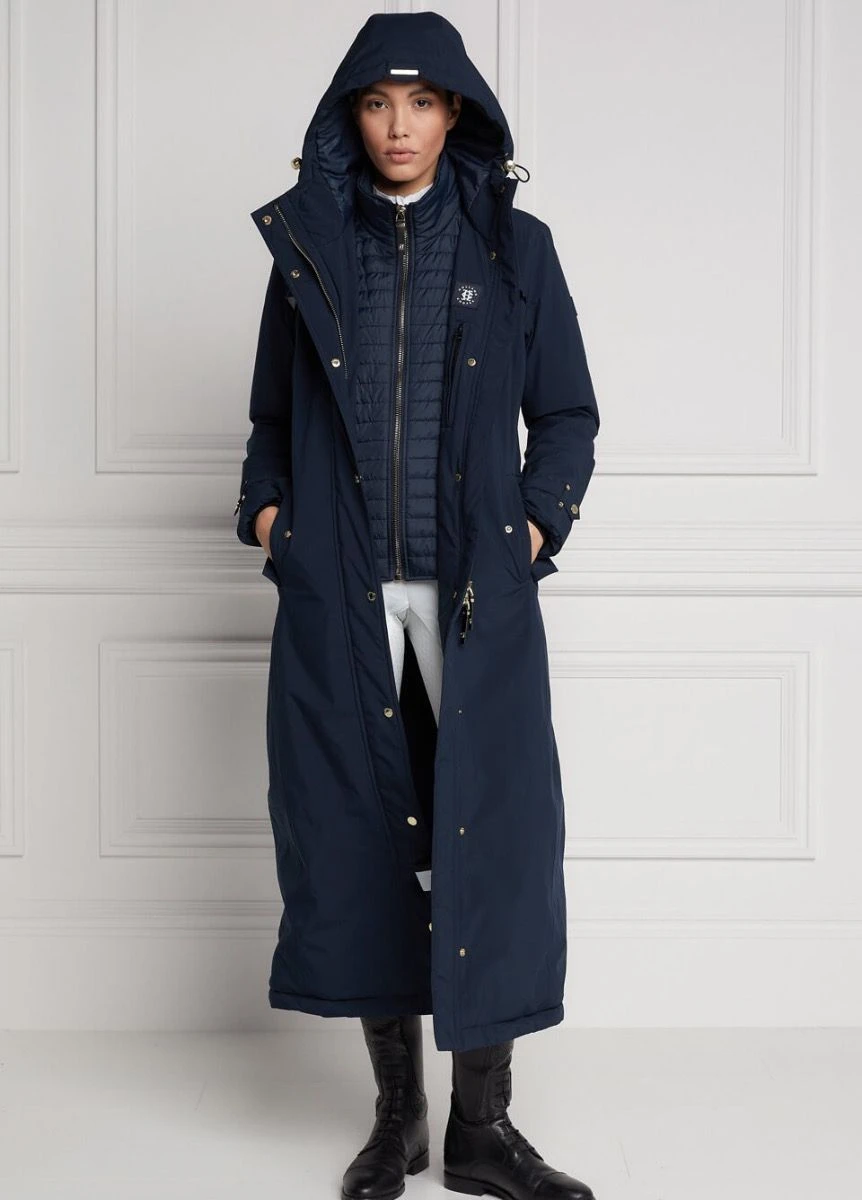 Designed with a detachable, faux fur trimmed hood and filled with eco-friendly fill, the super longline coat is perfect for those winter days spent at the yard. Curated with neoprene storm cuffs and cut with a flattering silhouette, this coat is both stylish and practical. Detailed with high-build tonal embroidering and finished with the iconic gold hardware and stirupping detailing.