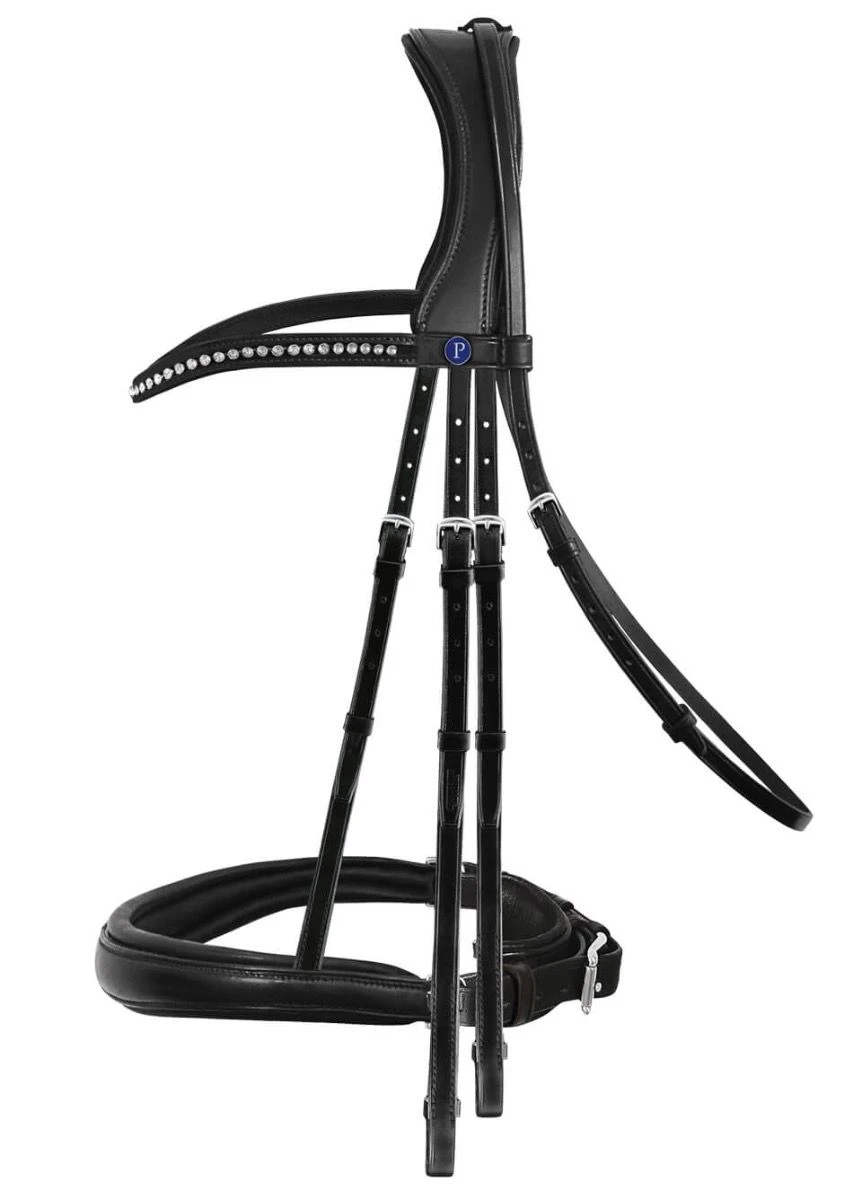 The PASSIERBLU Dream Double Bridle is part of the PASSIERBLU Collection and a dream come true! The anatomically-formed, extra-soft headpiece ensures optimal distribution of pressure on the horse’s poll, the horse-friendly Passier Caveson Special is anatomically-formed as well and softly lined. The waved browband comes with medium-sized Premium Crystals in Clear Crystal, with a brilliant sparkle that perfectly matches the stainless steel fittings or in Colorado Topaz, with a golden glow that looks beautiful when combined with brass fittings. Genuine only with the original PASSIERBLU label on the side of the browband. Includes reins 1x pair plain, 1x pair half rubber.