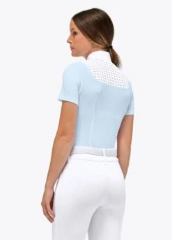 The Clarisse short Sleeve shirt features a thin pleated bib, shaped perfectly to sit in line with the competition jacket. An invisible zipper gives ease of use to the wearer, whilst the Swarovski Samshield blazon on the chest and delicate teardrop opening on the reverse add to the feminine feel of this garment. The material is a high stretch, breathable, technological fabric that wicks away sweat to keep the rider dry and comfortable and UV protection maintains the quality of the fabric and protects the riders skin in the summer months. Easy care, machine washable at 30’C and made in an eco conscientious manner.
