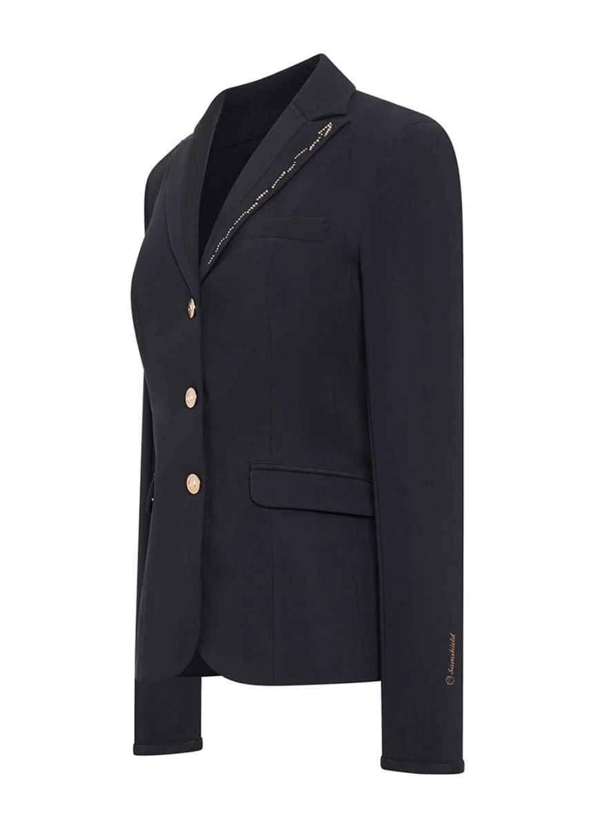 Louisa Crystal Flower with its high stretch italian fabric offers ultimate comfort to the rider, as well as excellent breathability from the inner mesh lining that wicks away sweat. The concealed zipper behind the buttons provides an impeccable fit paired with the elegant pleating on the reverse for ultimate body contouring. Finished beautifully with Flower Swarovski® embroidery, Samshield logo decorated with Swarovski® crystals on arm and Satin details throughout on cuffs, pockets and lapels.